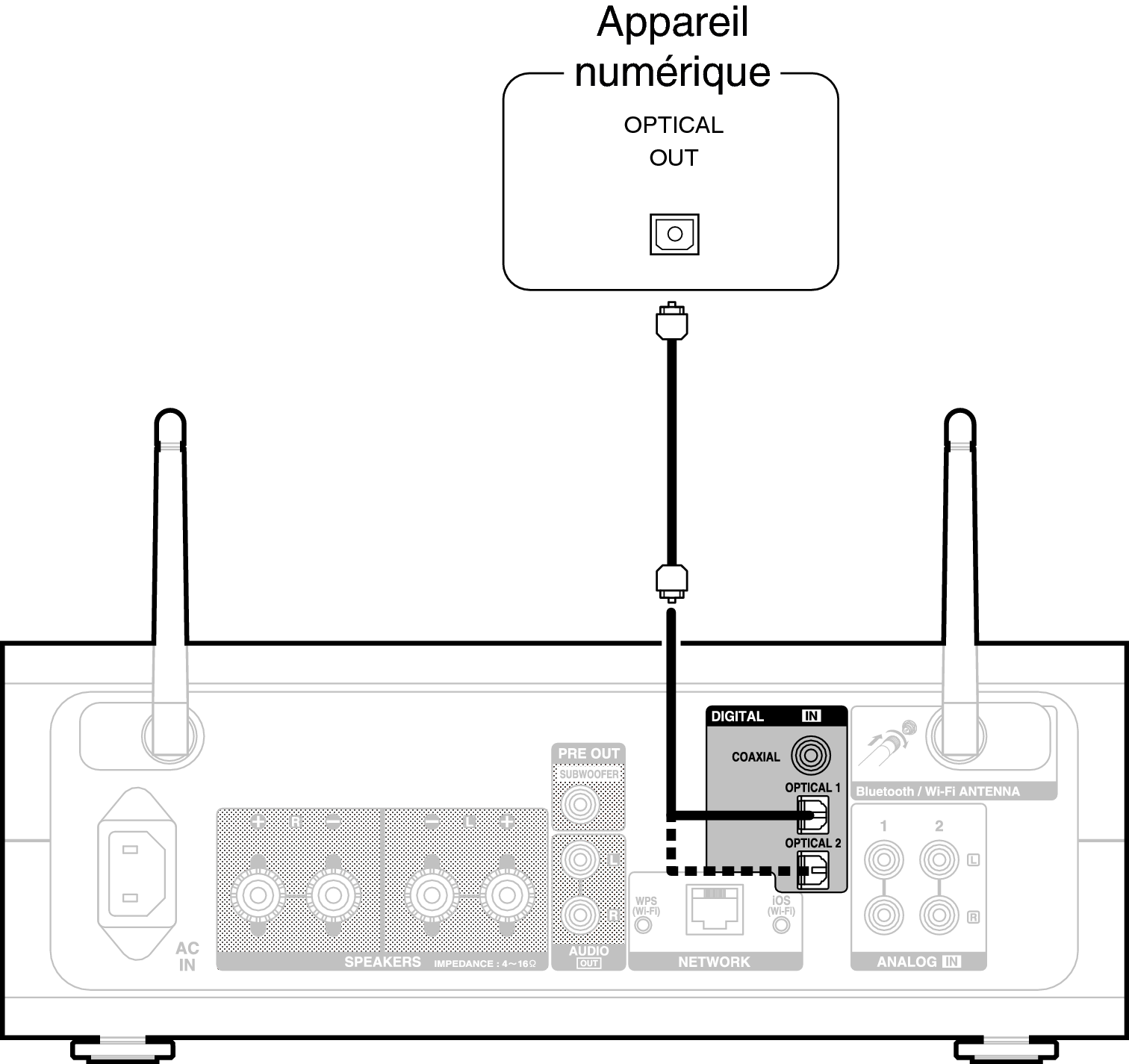 Vous pouvez connecter cet appareil à des périphériques équipés d’une sortie audio numérique.