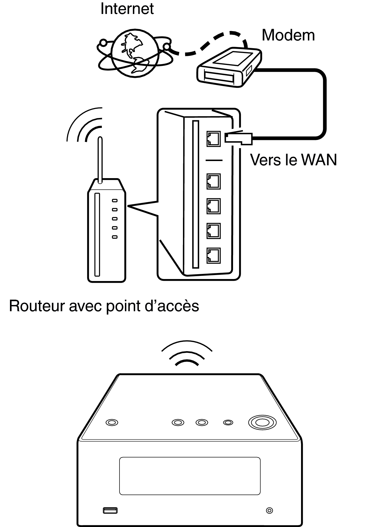 Lorsque vous utilisez un routeur compatible WPS (Wi-Fi Protected Setup), vous pouvez facilement vous connecter au Wi-Fi en appuyant sur la touche Wi-Fi CONNECT/WPS sur cette unité. (Reportez-vous au “Quick Setup Guide” fourni séparément.)