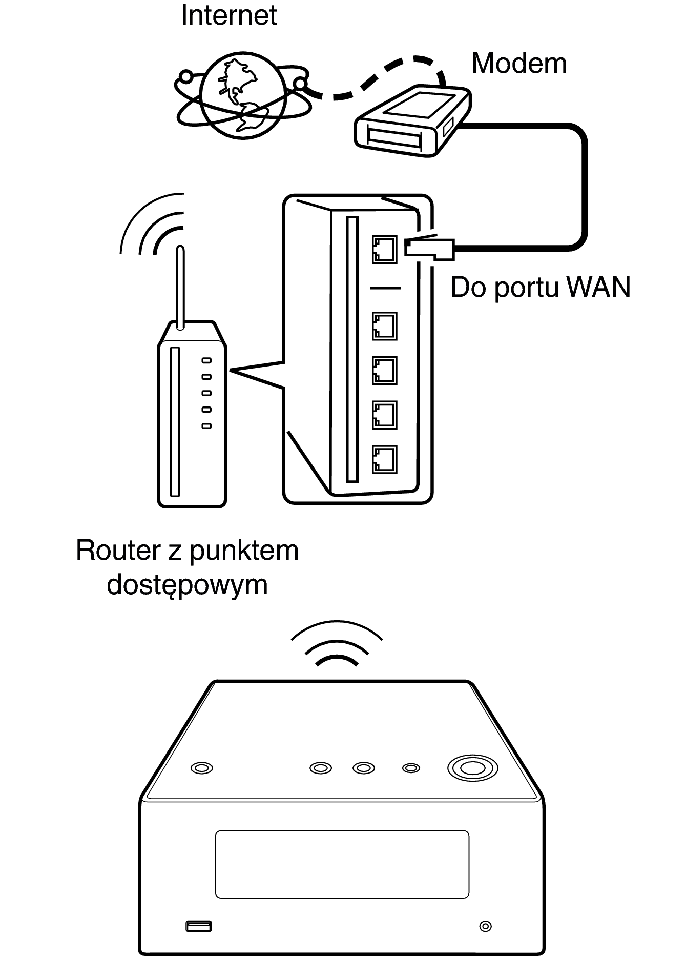 W przypadku używania routera zgodnego z obsługą standardu WPS (Wi-Fi Protected Setup) można łatwo nawiązać połączenie bezprzewodowe, naciskając przycisk Wi-Fi CONNECT/WPS tego urządzenia. (Patrz oddzielny “Skrócony podręcznik instalacji”.)