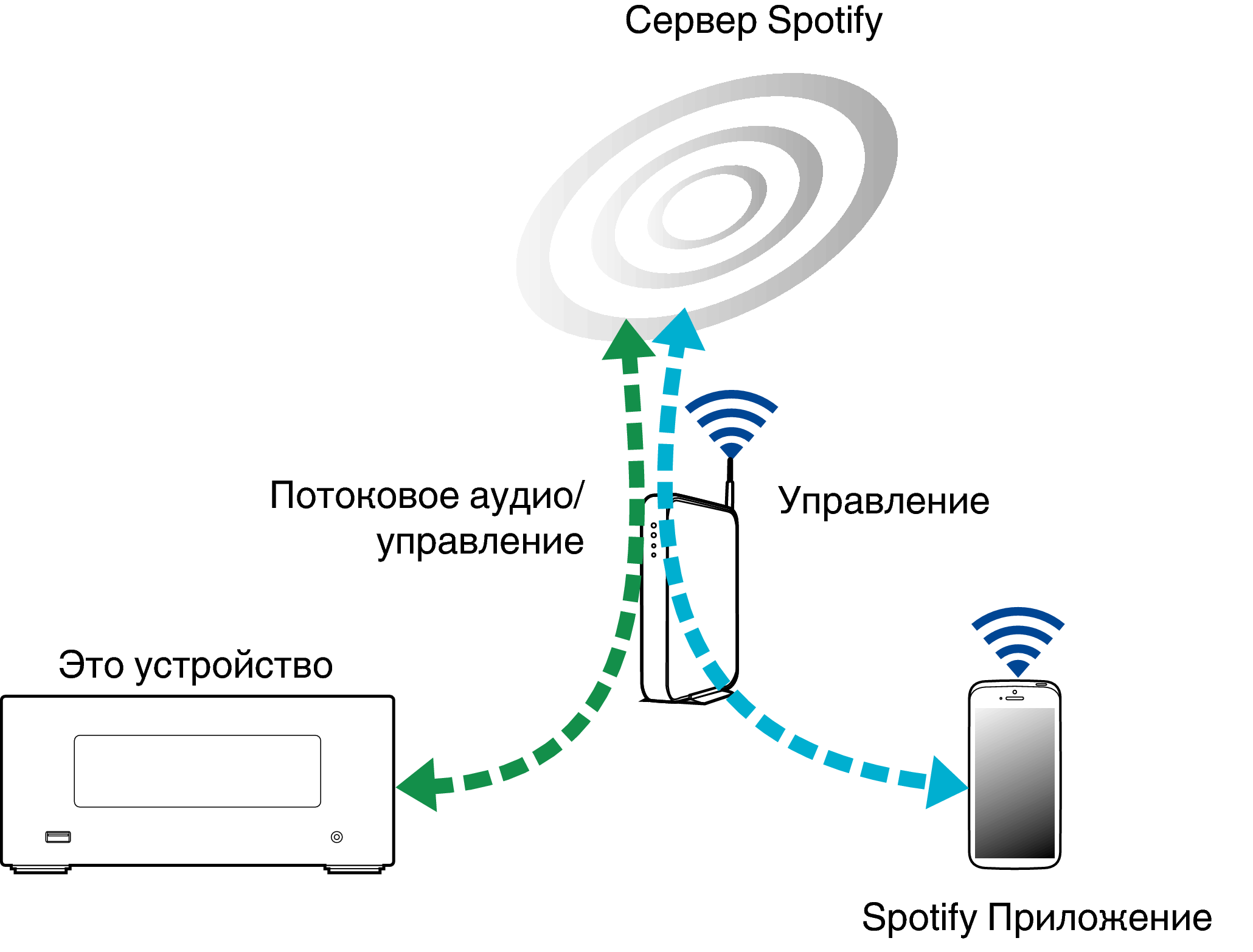 Spotify является самой популярной в мире службой потоковой передачи. Если Вы подпишитесь на Spotify Premium, Вы сможете управлять Вашей новой акустической системой при помощи Вашего телефона или планшета. Поскольку Spotify встроен в акустическую систему, Вы сможете делать звонки или использовать другие приложения - музыка никогда не остановится.