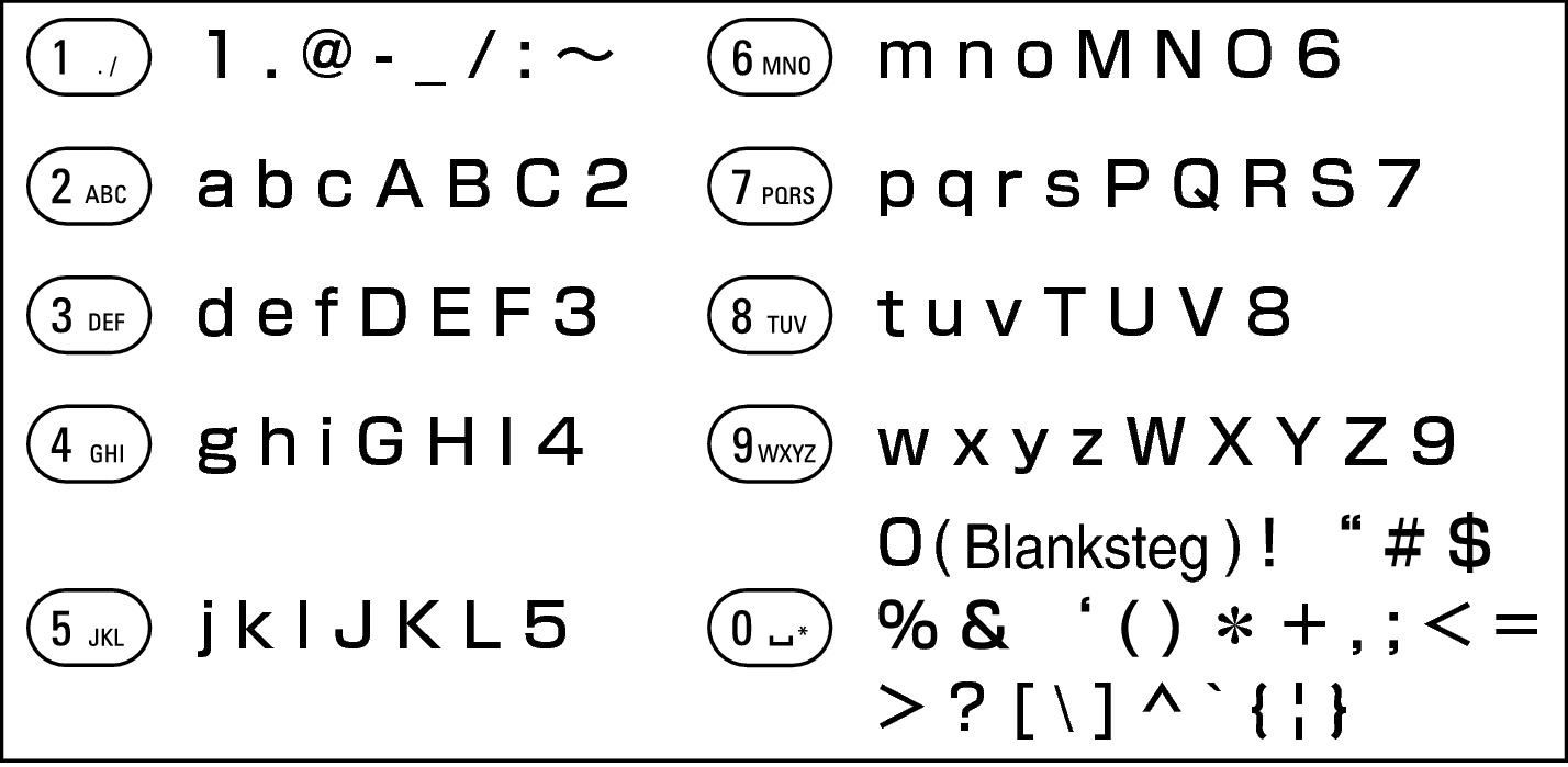 Tecknen som kan matas in visas nedan.