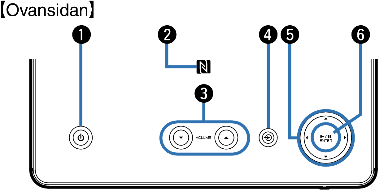 Spelar upp och pausar ett spår, och anger det valda innehållet.