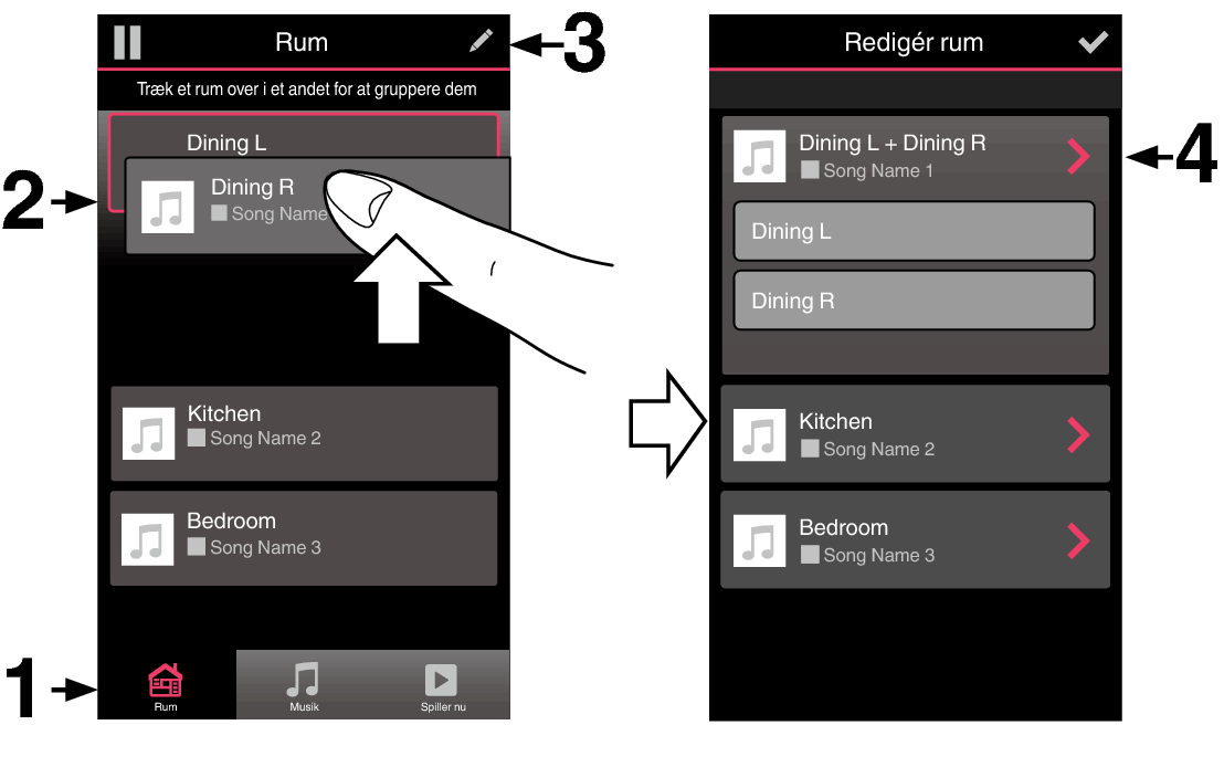Opret en gruppe, der KUN indeholder to matchende højttalere (se Gruppering af rumlink).