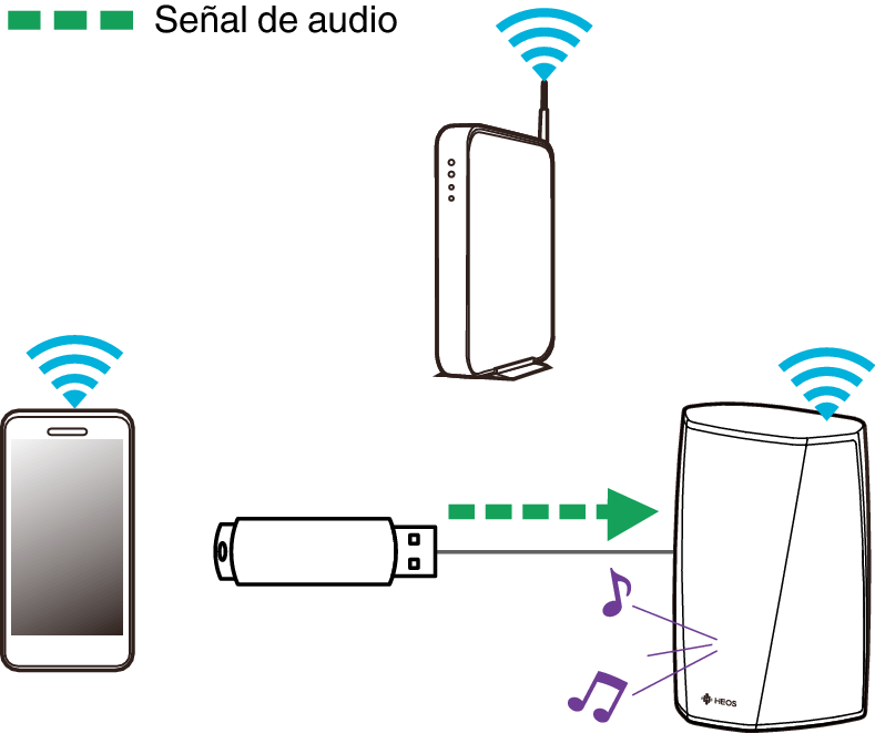 Puede que el nombre de su dispositivo HEOS tarde varios minutos en aparecer en la lista de “Música USB” si tiene almacenados un gran número de archivos en el dispositivo USB.