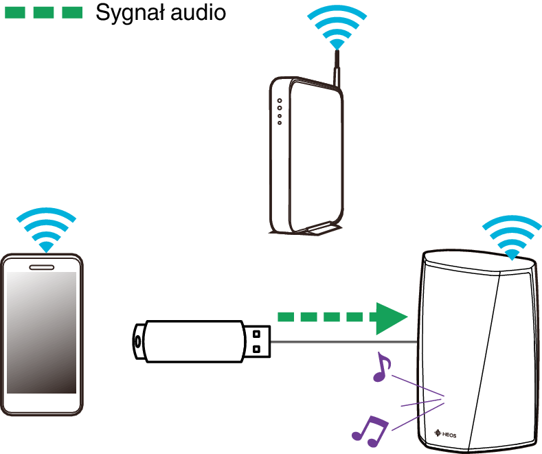 Jeśli w pamięci USB zapisano dużą liczbę plików muzycznych, nazwa urządzenia HEOS może pojawić się na liście “Muzyka z USB” dopiero po kilku minutach.