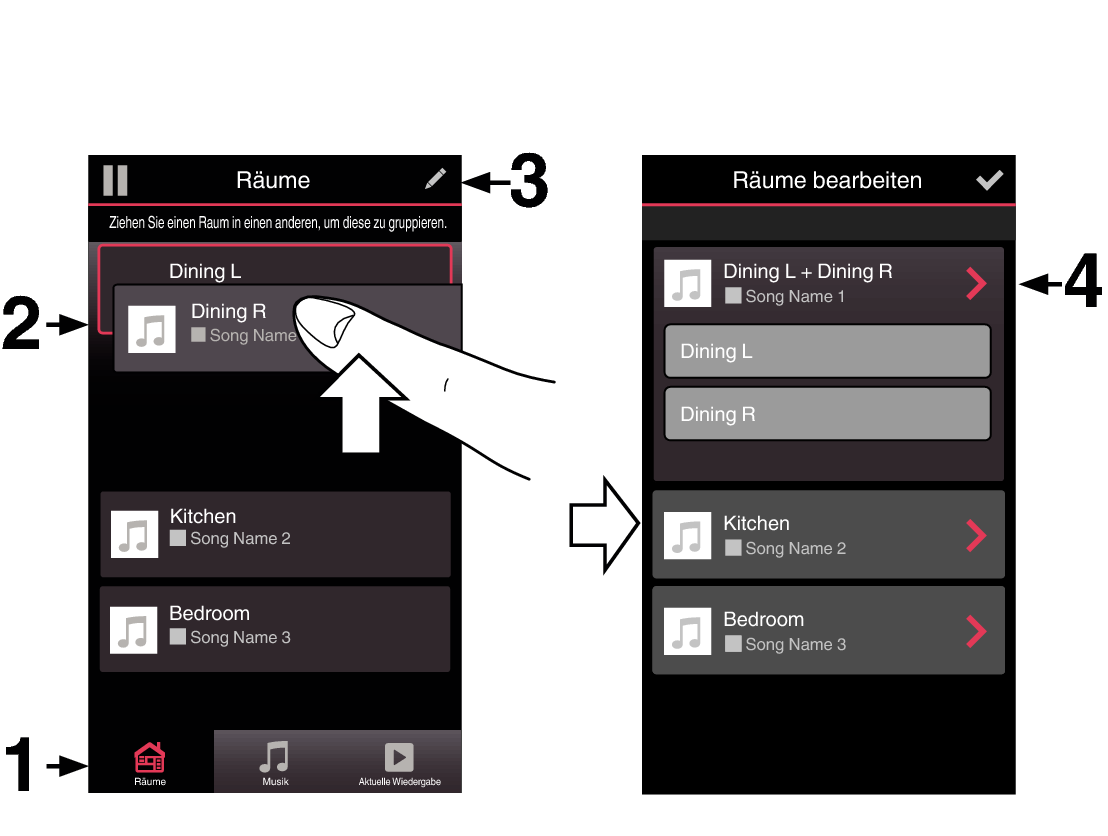 Die Gruppe der beiden passenden Lautsprecher wird jetzt als einzelner Raum angezeigt. Sie können den Namen des Raums mit dem Stereo-Paar jederzeit ändern.