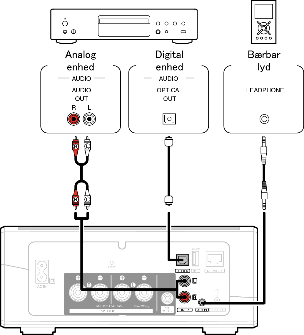 Tilslut indgangene LINE IN, AUX IN eller OPTICAL IN til en enhed for lydafspilning (CD-afspiller, bærbar musikafspiller, osv...) ved hjælp af egnede kabler.