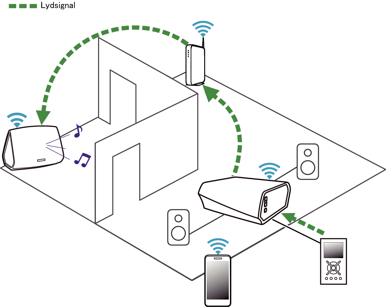 Lyden fra lydenheden kan afspilles direkte på den valgte enhed eller digitaliseres og sendes over dit netværk til andre HEOS-enheder.