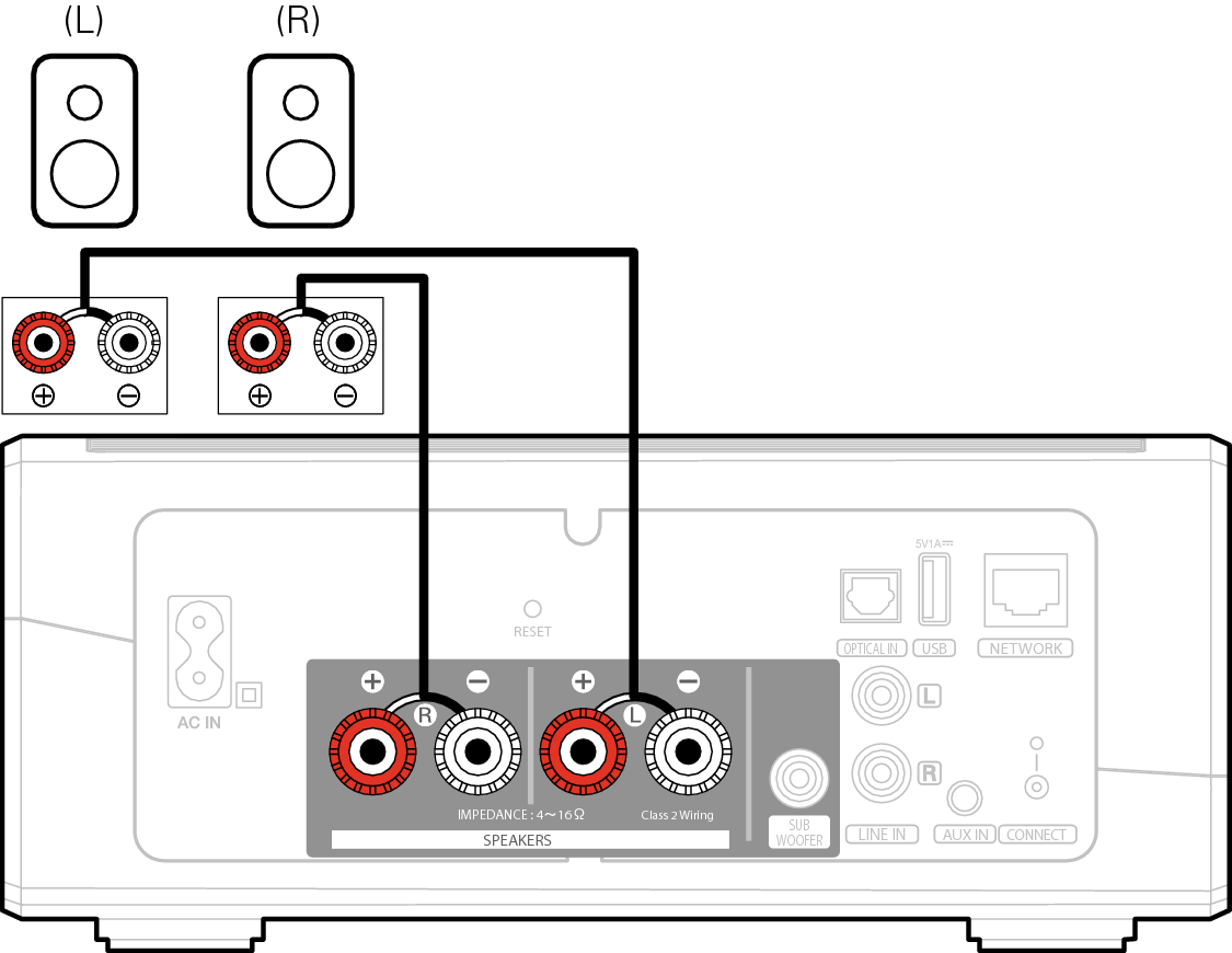Sprawdź, czy złącza lewego (L) i prawego (P) kanału głośników zostały prawidłowo podłączone do tego urządzenia oraz czy została zachowana odpowiednia polaryzacja przewodów: + (czerwony) i – (czarny).