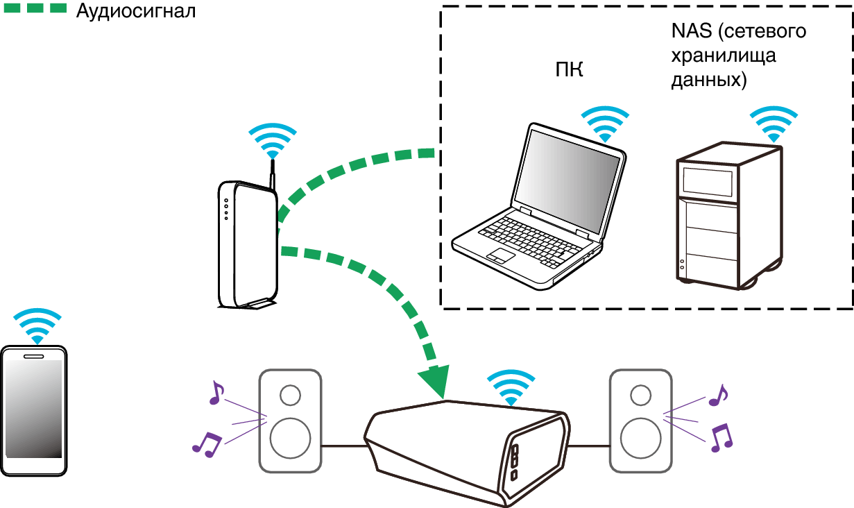 Воспроизведение музыки c сетевого ПК или NAS