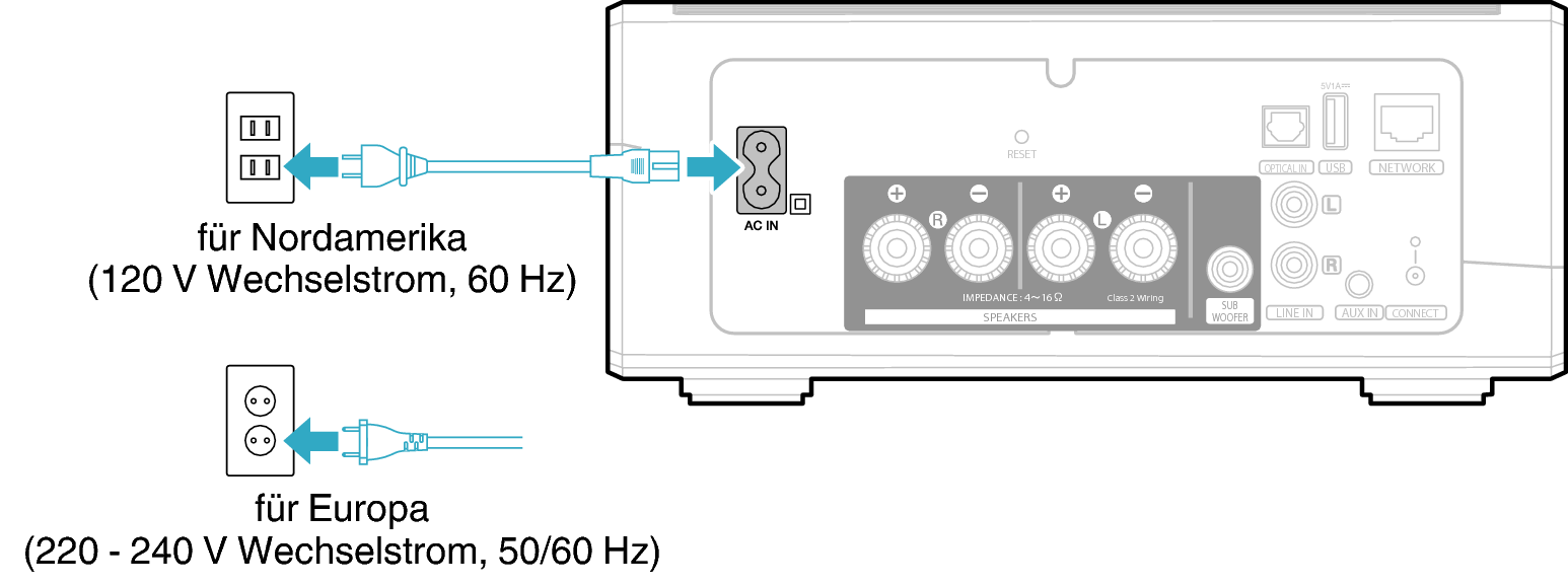 Schließen Sie das mitgelieferte Netzkabel an der Rückseite des HEOS Amp und den Stecker an einer Wandsteckdose an.