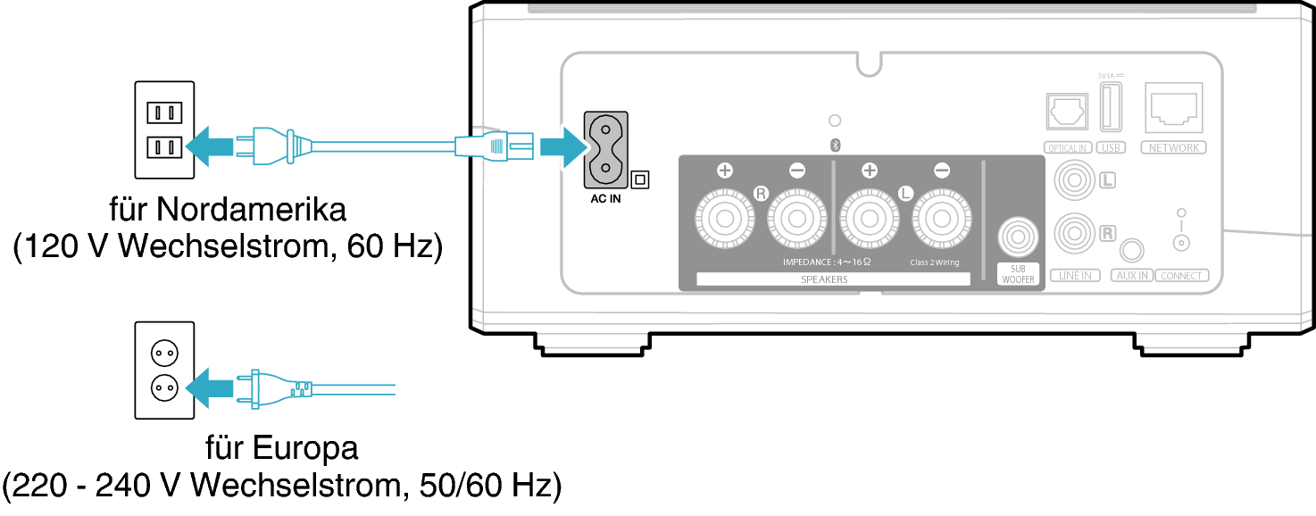 Schließen Sie das mitgelieferte Netzkabel an der Rückseite des HEOS Amp und den Stecker an einer Wandsteckdose an.