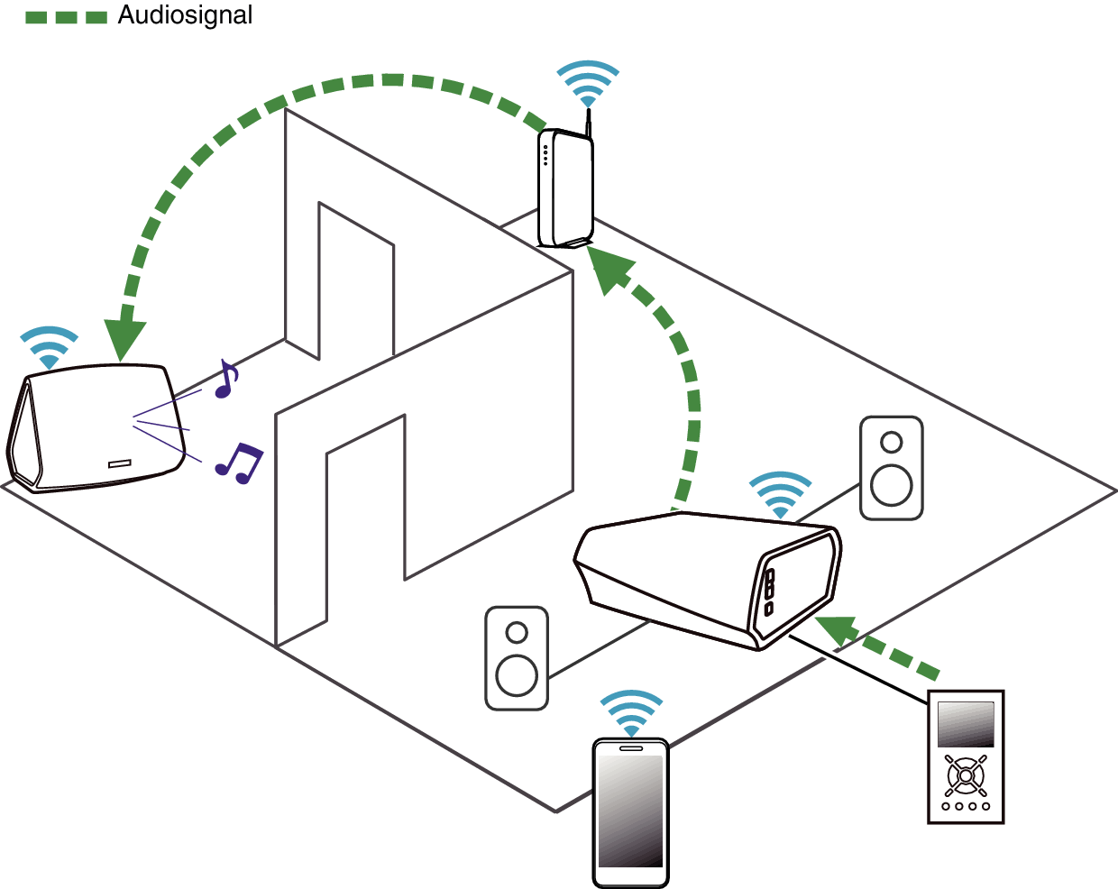 Der Ton des Audiogeräts kann direkt über das ausgewählte Gerät wiedergeben oder digitalisiert über das Netzwerk an andere HEOS-Geräte gesendet werden.