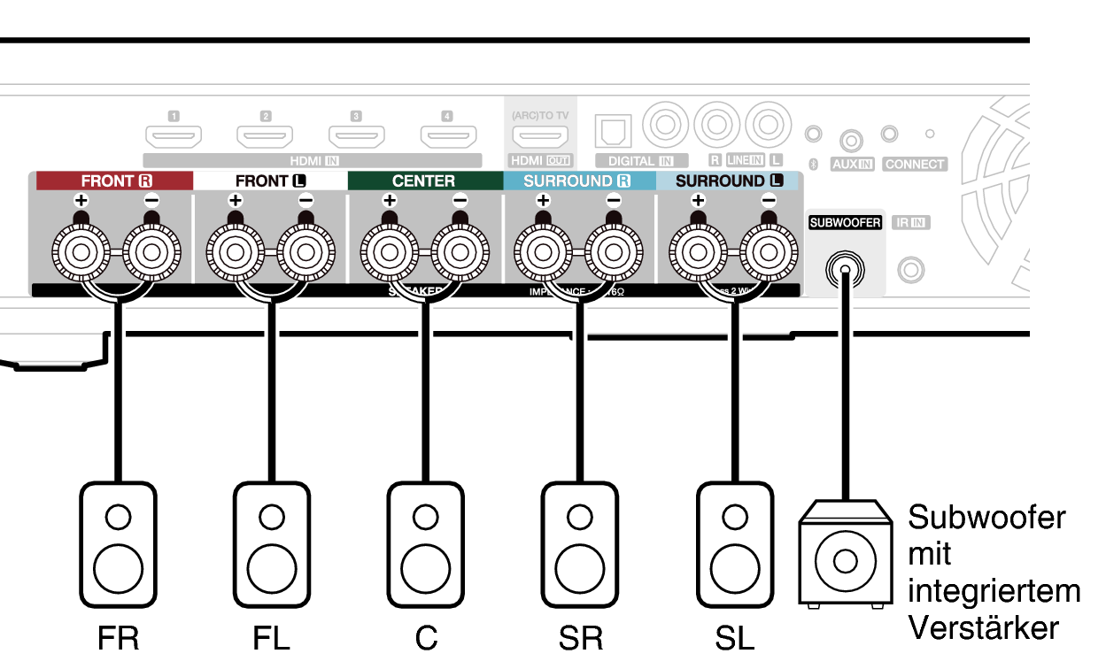 Trennen Sie den Netzstecker dieses Geräts von der Netzsteckdose, bevor Sie die Lautsprecher anschließen. Schalten Sie außerdem angeschlossene, aktive Subwoofer aus.