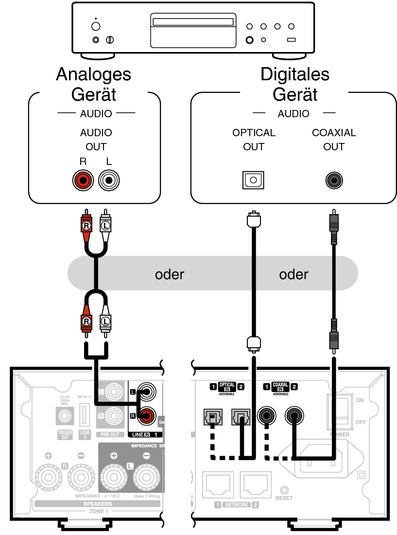 Schließen Sie den LINE IN-, COAXIAL IN- oder OPTICAL IN-Eingang über geeignete Kabel an ein Gerät für die Audiowiedergabe (CD-Player, tragbarer Audio-Player etc.) an.