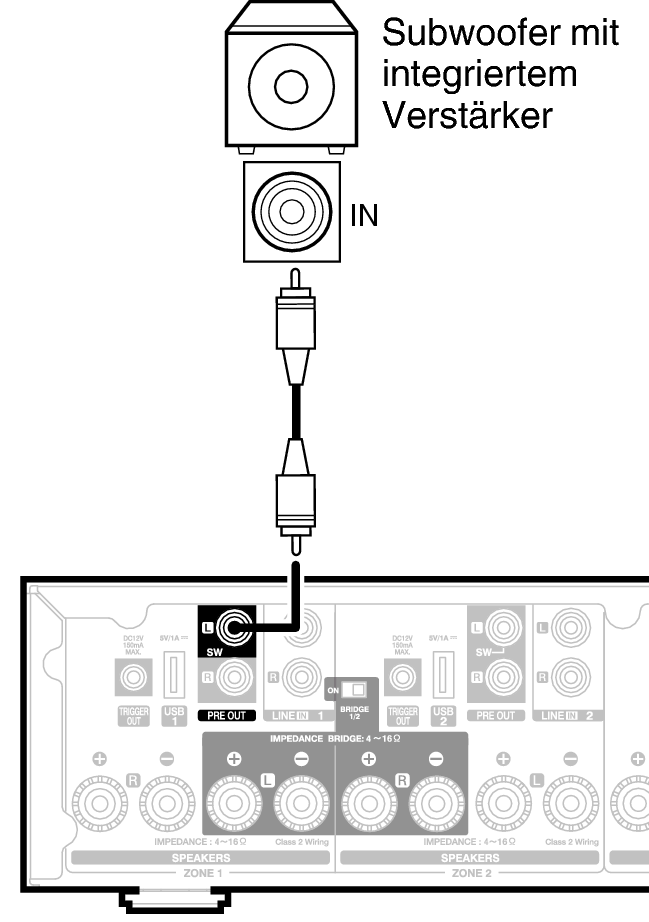 Schließen Sie den PRE OUT “L”-Ausgang an einen Eingang Ihres aktiven Subwoofers oder Ihres Subwoofer-Verstärkers an. Link