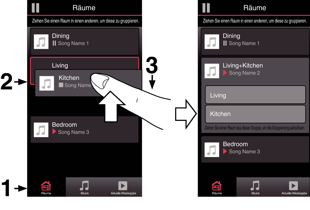 Die beiden Räume werden zu einer einzelnen Gerätegruppe zusammengeführt, und in beiden Räumen wird die gleiche Musik in perfekter Synchronisation wiedergegeben.