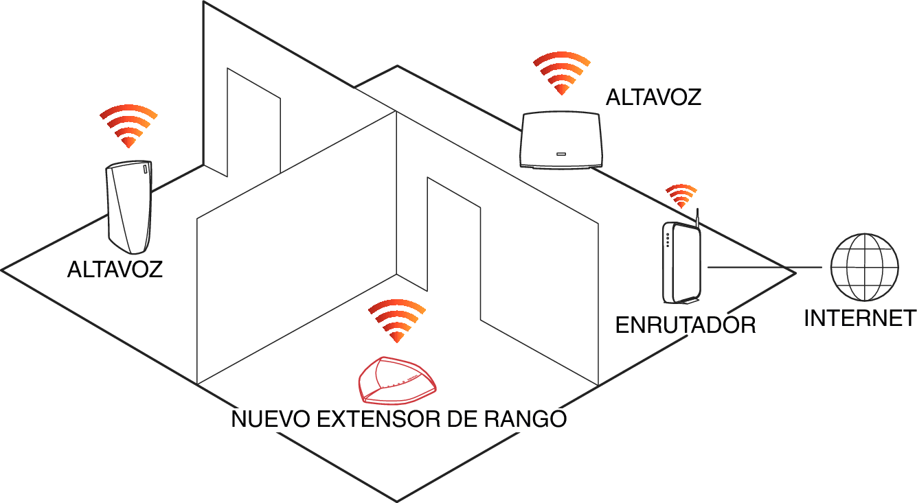 Ubique HEOS Extend en un lugar conveniente entre su enrutador de red inalámbrico existente y el dispositivo que podría encontrarse fuera del rango de su enrutador de red inalámbrico.