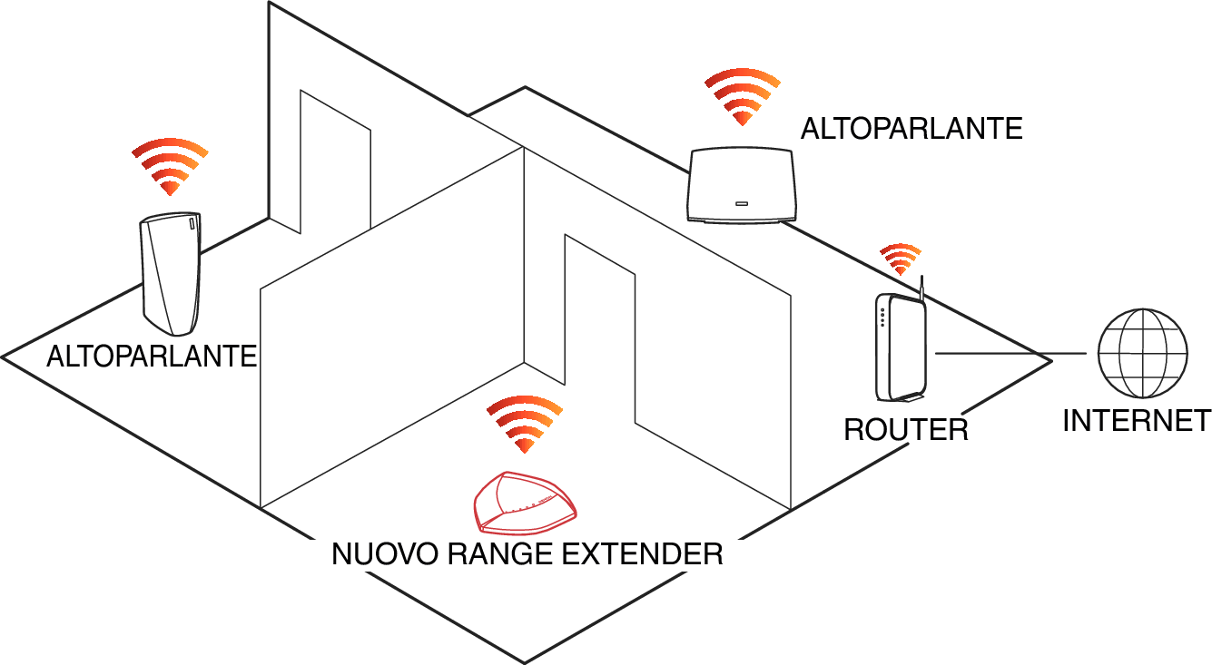 Posizionare HEOS Extend in una posizione conveniente tra il Router di Rete Wireless esistente e il dispositivo che potrebbe trovarsi fuori dall’intervallo del router di Rete Wireless.