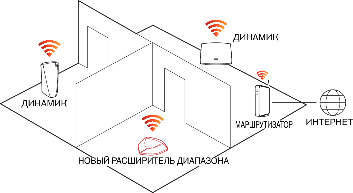 Расположите устройство HEOS Extend в удобном месте между Вашим беспроводным сетевым маршрутизатором и устройством, которое может находиться вне диапазона действия Вашего беспроводного сетевого маршрутизатора.