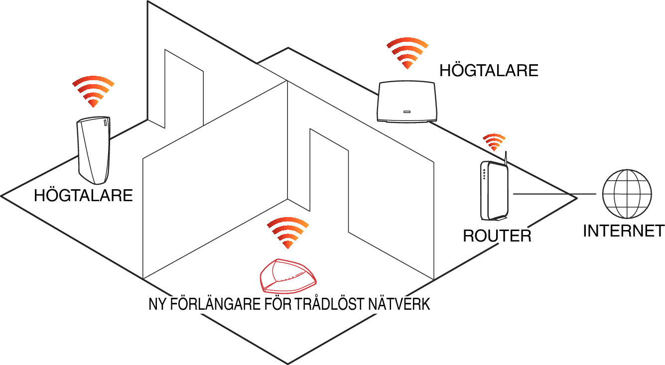 Placera HEOS Extend på en lämplig plats mellan din existerande trådlösa nätverksrouter och enheten som kan vara utom räckvidd för din trådlösa nätverksrouter.