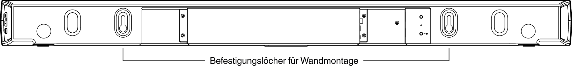 Stellen Sie sicher, dass die Anschlusskabel an der Wand befestigt werden, um zu verhindern, dass an den Kabeln gezogen wird oder Stolpergefahr besteht. Andernfalls kann die Einheit herunterfallen. Überprüfen Sie, ob die Einheit nach Abschluss der Montagearbeiten sicher befestigt ist. Es wird empfohlen, ein Sicherheitskabel (nicht im Lieferumfang enthalten) an der Bohrung für die Sicherheitsverkabelung auf der Unterseite der Soundbar anzubringen, um Personen- oder Sachschäden zu verhindern, falls der Lautsprecher aus irgendeinem Grund zu Boden fällt.
