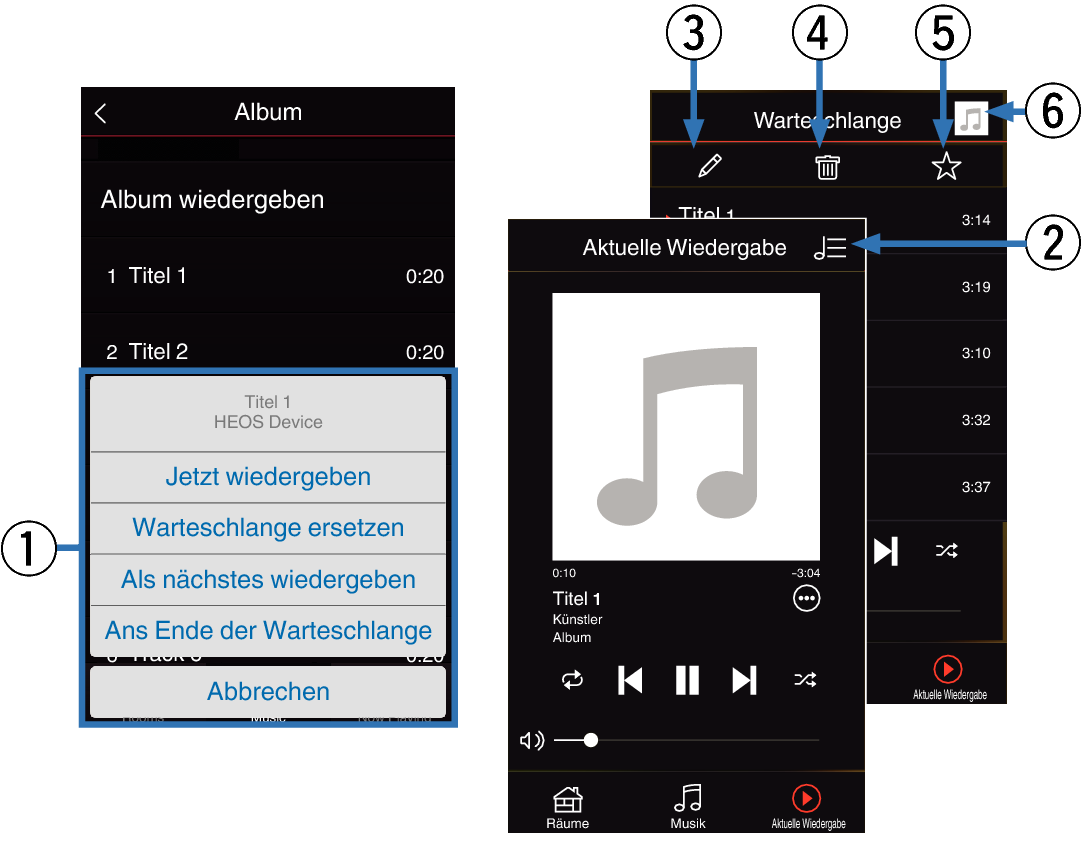 HEOS verwendet eine Wiedergabe “Warteschlange”, in die die Musik eingefügt wird, die Sie wiedergeben möchten. Musik kann aus allen lokalen oder Online-Musikquellen ausgewählt werden (mit Ausnahme von vorprogrammierten Streams vom Typ “Radio” oder “Sender”). Diese Funktion besitzt Ähnlichkeiten mit einer Jukebox. Sie wählen etwas für die Wiedergabe aus (einen Titel, ein Album, eine Wiedergabeliste oder sogar Ihre gesamte Musiksammlung) und fügen dies der “Warteschlange” hinzu. Wenn Sie etwas für die Wiedergabe auswählen, werden Sie gefragt, wie Ihre Musik in die Warteschlange gestellt werden soll.
