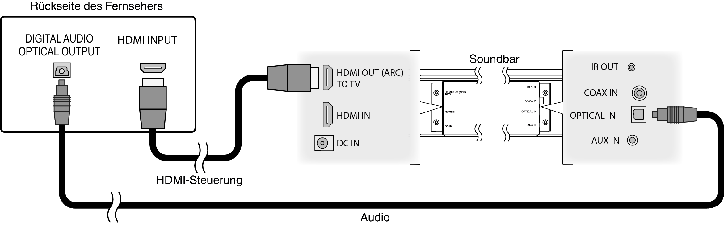 Nehmen Sie einen Anschluss an einen nicht mit ARC (Audio Return Channel) kompatiblen Fernseher mithilfe des HDMI-Kabels und eines Audioeingangskabels vor.