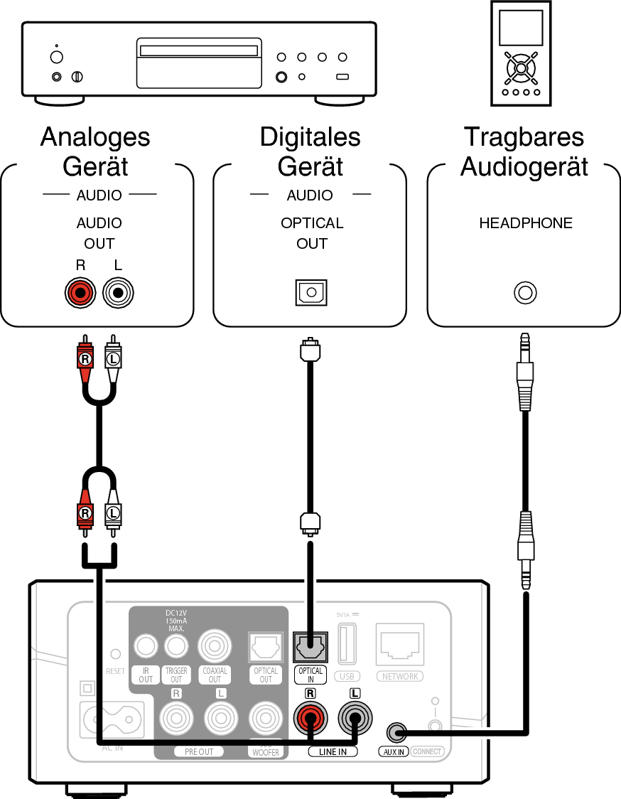 Schließen Sie den LINE IN-, AUX IN- oder OPTICAL IN-Eingang über geeignete Kabel an ein Gerät für die Audiowiedergabe (CD-Player, tragbarer Audio-Player etc.) an.