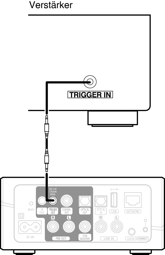 Wenn der Verstärker, der an dieses Gerät angeschlossen werden soll, über einen Trigger-Eingangsanschluss verfügt, schließen Sie diesen mit dem 3,5-mm-Kabel (nicht im Lieferumfang enthalten) an die TRIGGER OUT-Buchse dieses Geräts an. Von der TRIGGER OUT-Buchse wird ein Signal von bis zu 12 V/150 mA ausgegeben.
