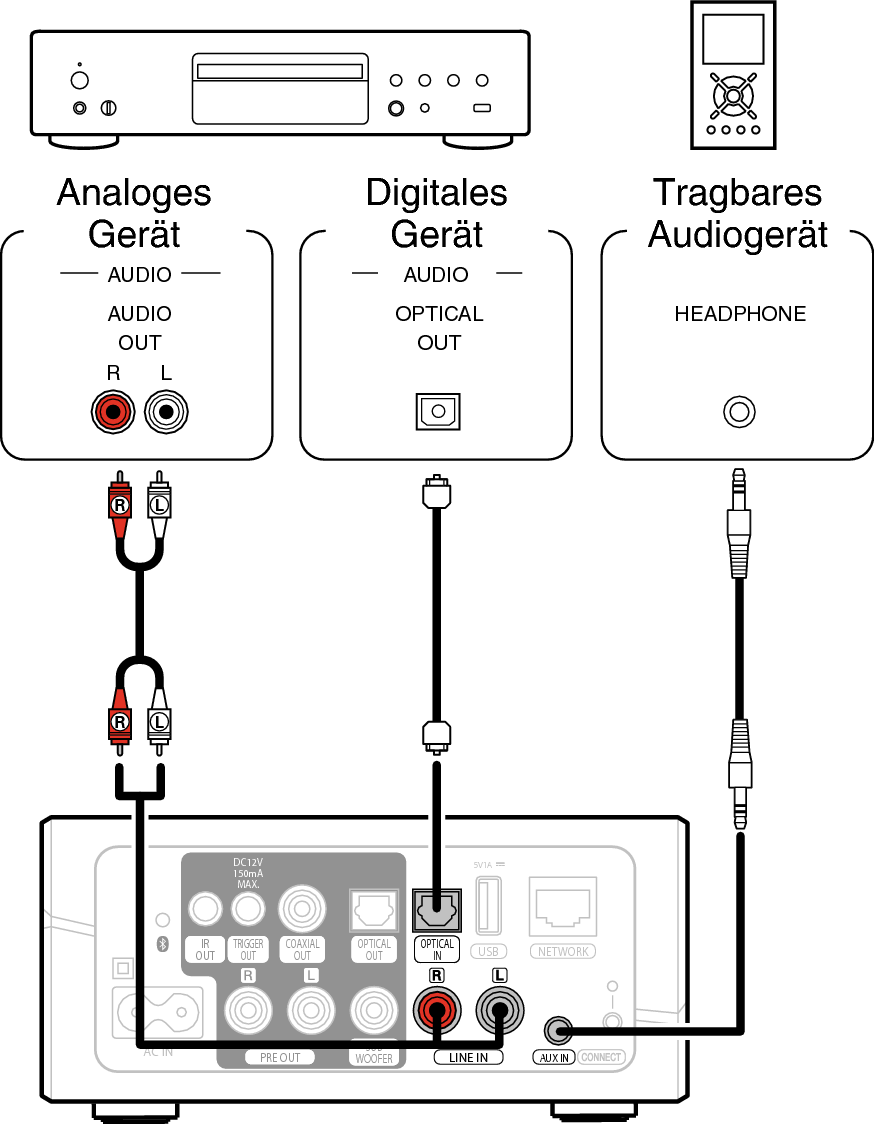 Schließen Sie den LINE IN-, AUX IN- oder OPTICAL IN-Eingang über geeignete Kabel an ein Gerät für die Audiowiedergabe (CD-Player, tragbarer Audio-Player etc.) an.