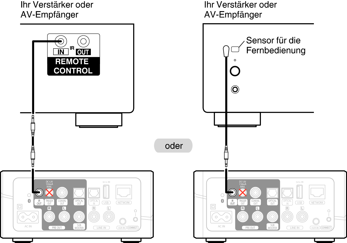 Falscher Anschluss des IR-Steuerkabels (IR-Direktkabel/IR-Senderkabel) an den Trigger-Ausg.-Anschluss von HEOS Link kann den angeschlossenen AV-Empfänger, den Verstärker oder das IR-Senderkabel beschädigen.
