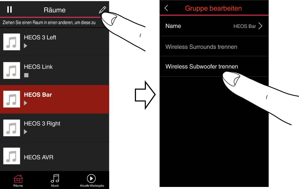 Tippen Sie das HEOS-Gerät an, von dem der HEOS-Subwoofer getrennt werden soll.