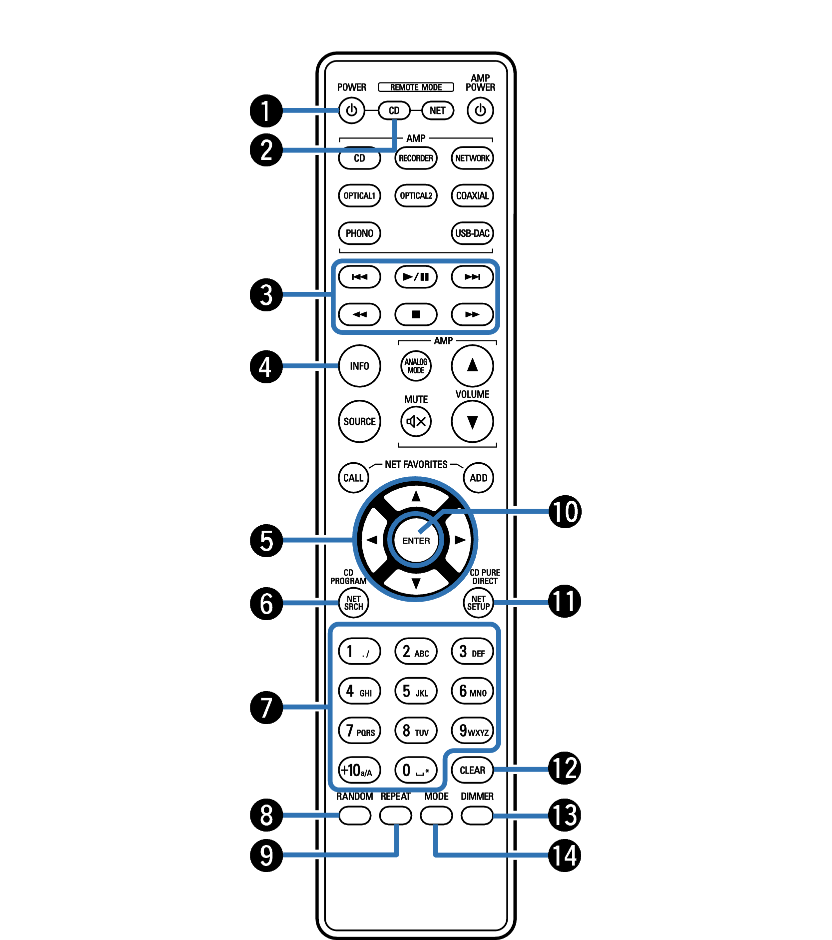 Pour faire fonctionner un lecteur audio réseau Denon, appuyez sur la touche REMOTE MODE NET pour basculer la télécommande en mode de fonctionnement de lecteur audio réseau.