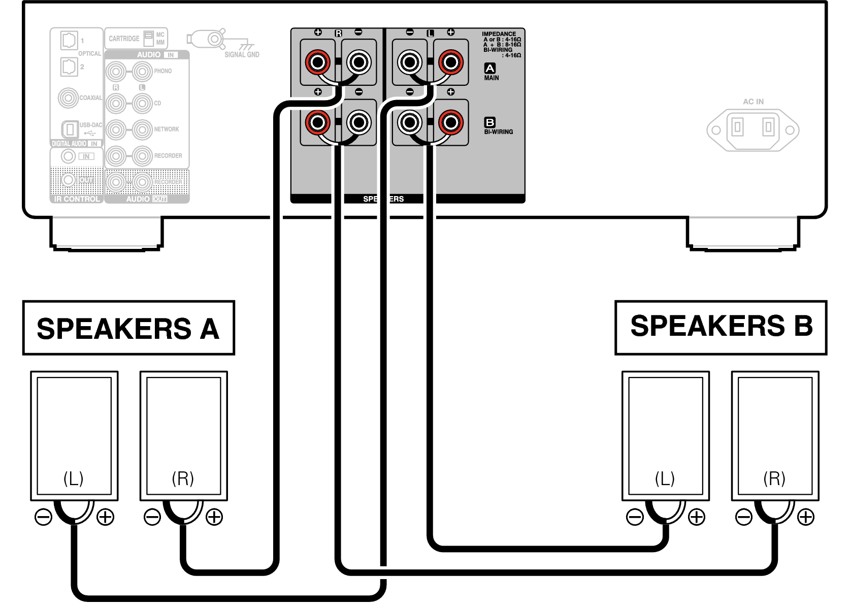 Dieses Gerät verfügt über zwei Paare von Lautsprecheranschlüssen (SPEAKER A und SPEAKER B). An jedes Paar Anschlüsse kann ein Paar Lautsprecher angeschlossen werden, und insgesamt können zwei Lautsprecherpaare angeschlossen werden.