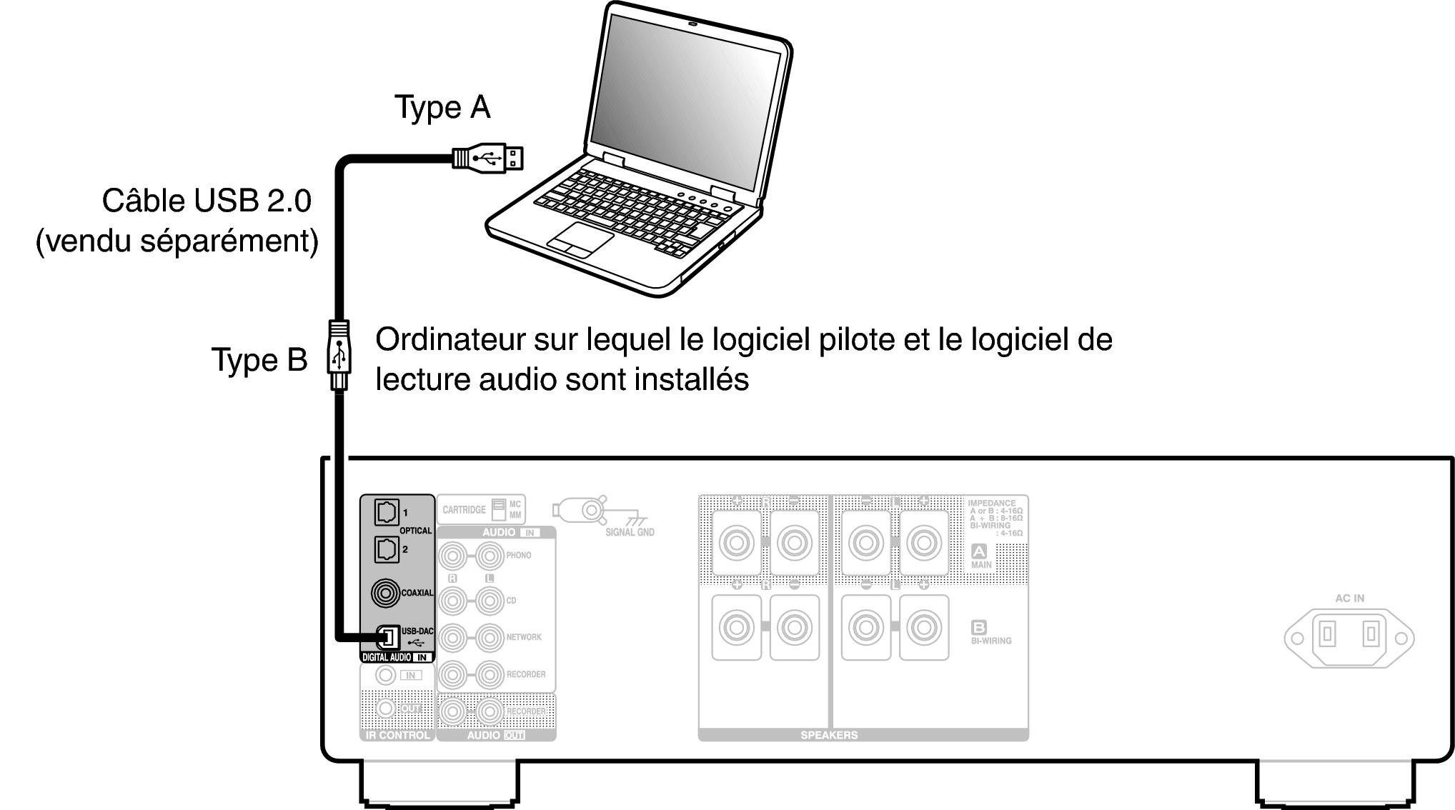 En connectant un ordinateur au port USB-DAC sur le panneau arrière de cet appareil à l’aide d’un câble de connexion USB disponible dans le commerce, cet appareil peut être utilisé comme un convertisseur N/A. lien