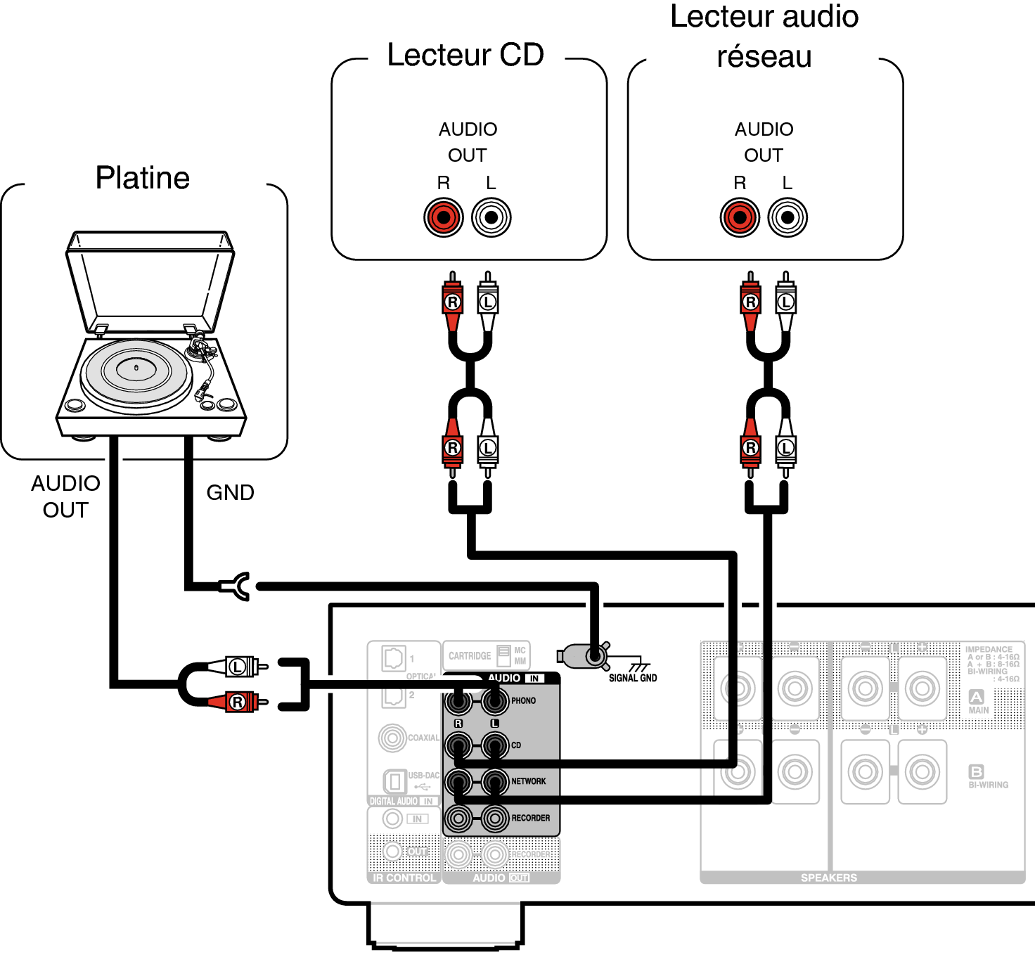 Vous pouvez connecter des platines, des lecteurs CD et des lecteurs audio réseau à cet appareil.