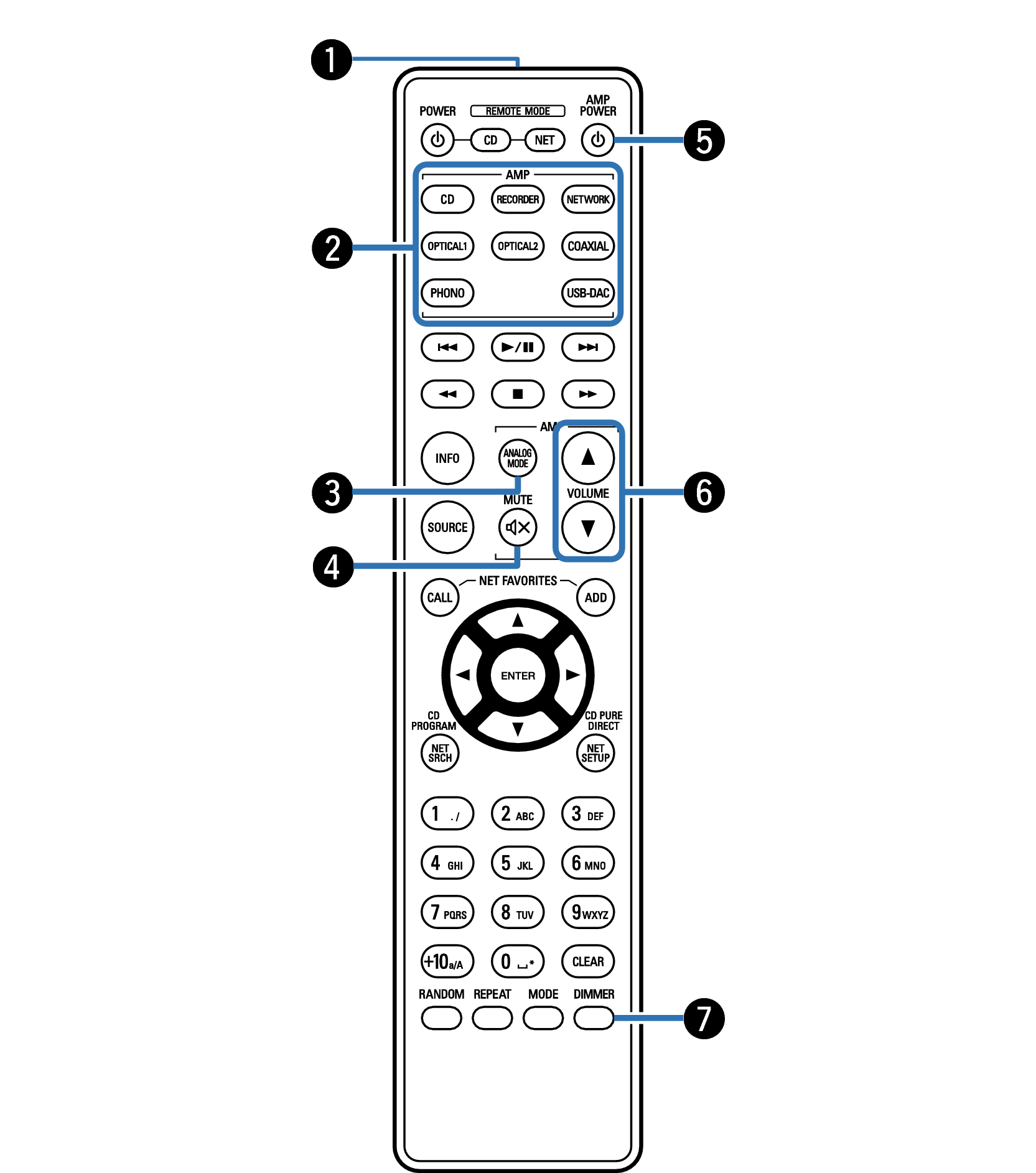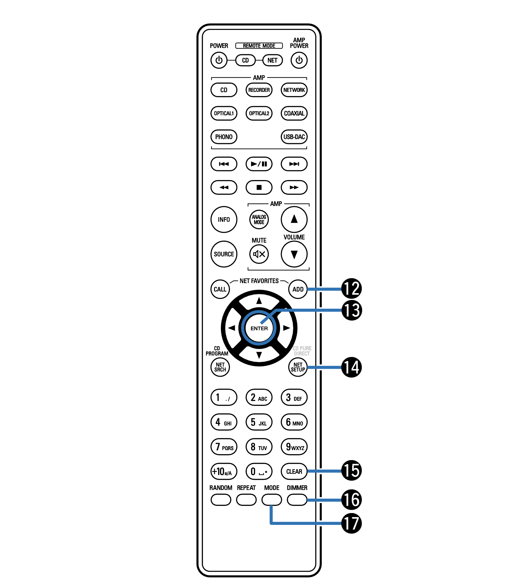 Pour faire fonctionner un lecteur audio réseau Denon, appuyez sur la touche REMOTE MODE NET pour basculer la télécommande en mode de fonctionnement de lecteur audio réseau.