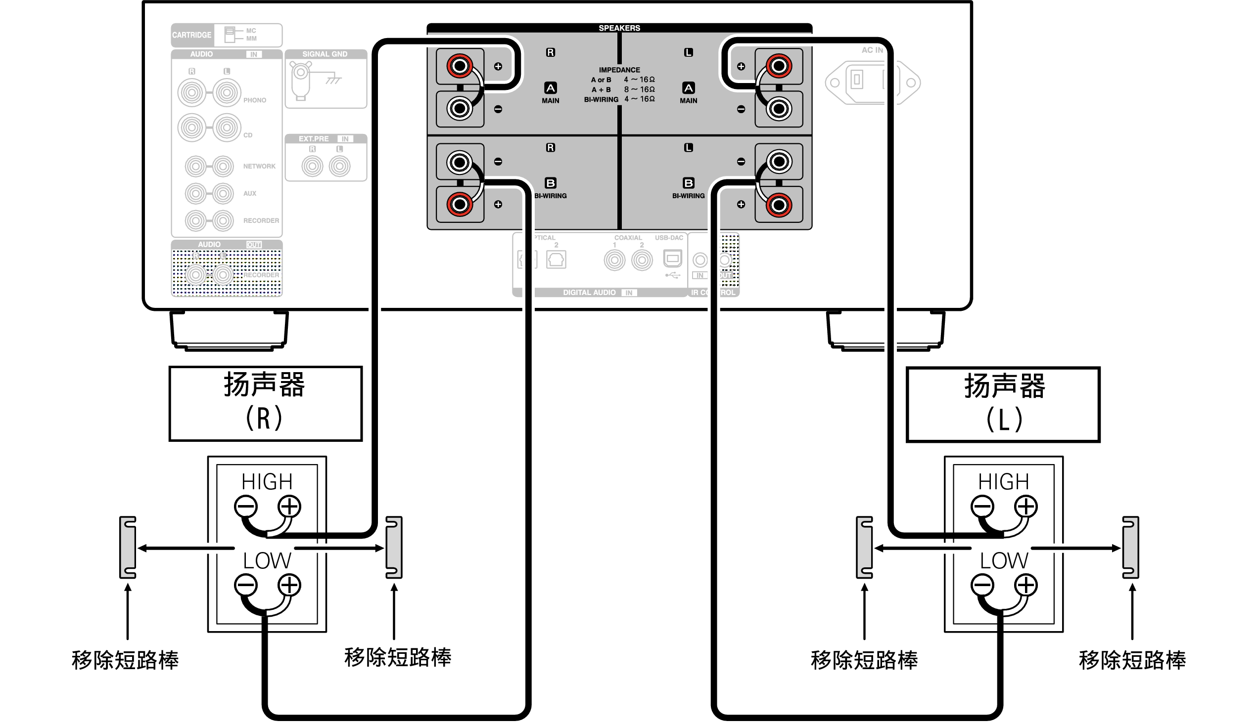 当用可双线分音的扬声器进行双线分音连接时,将中,高频范围的端子连接至SPEAKERS A(或SPEAKERS B),低频范围端子则连接至SPEAKERS B(或SPEAKERS A)。