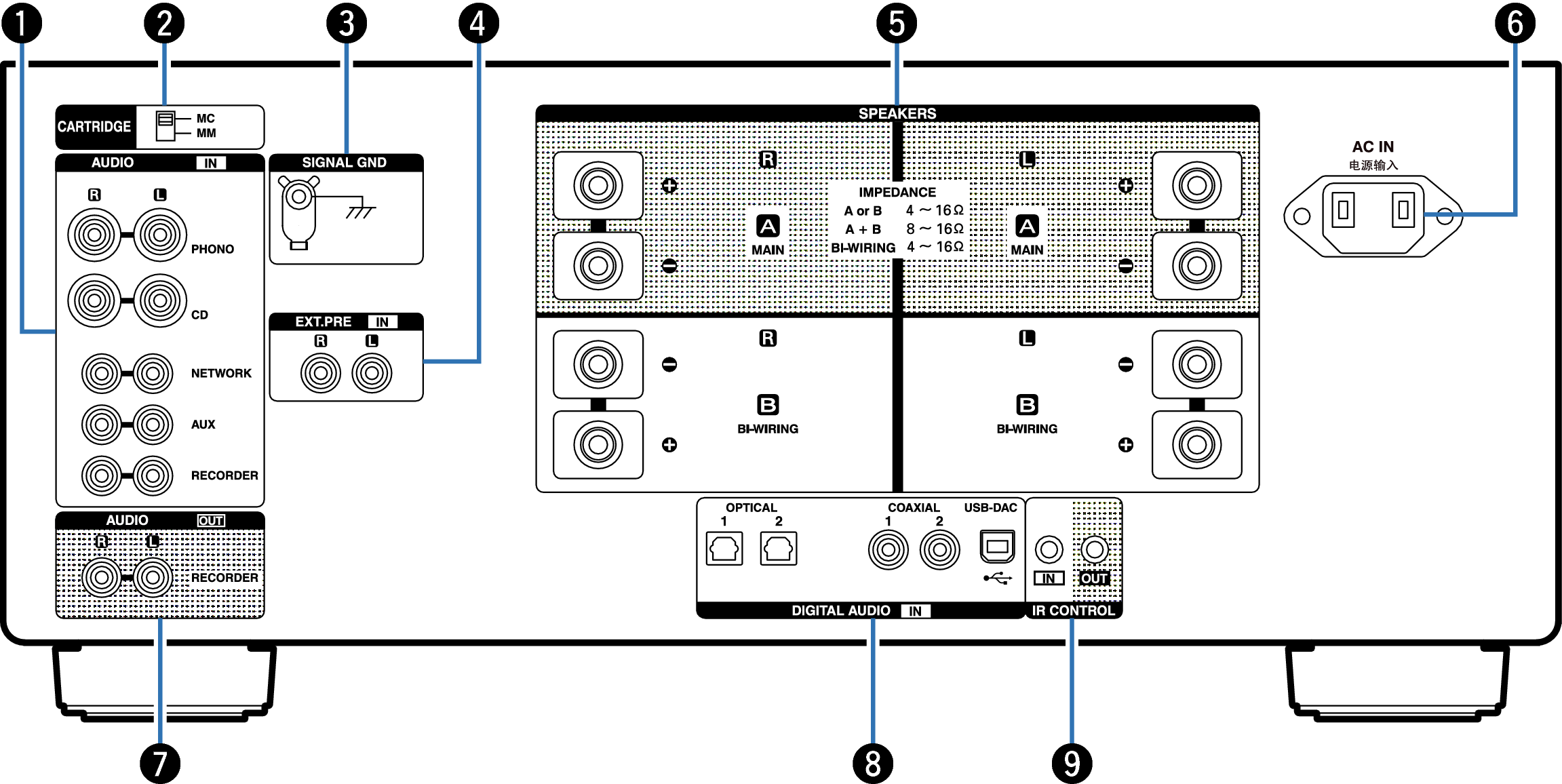 当本机用作功率放大器时,用于连接前置放大器。链接
