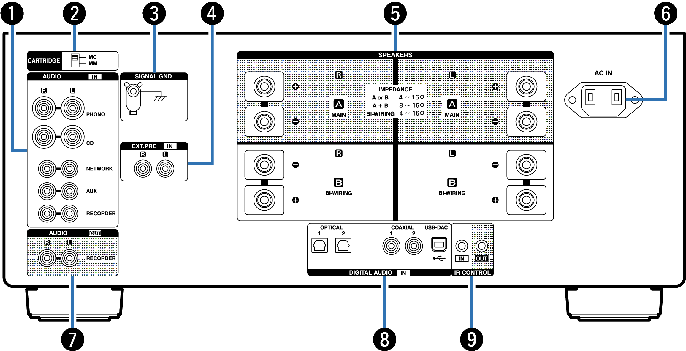 Utilisés pour connecter un préamplificateur lorsque cet appareil est utilisé comme amplificateur de puissance. lien