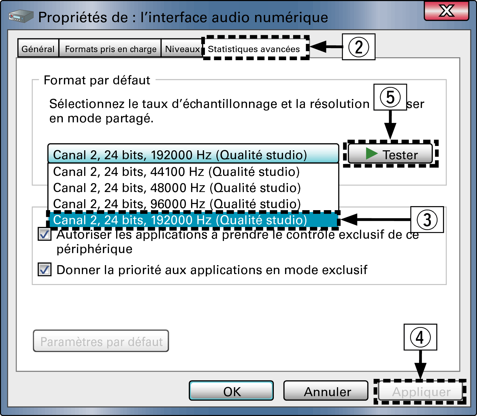 Il est recommandé que “Canal 2, 24 bits, 192000 Hz (Qualité studio)” soit sélectionné.