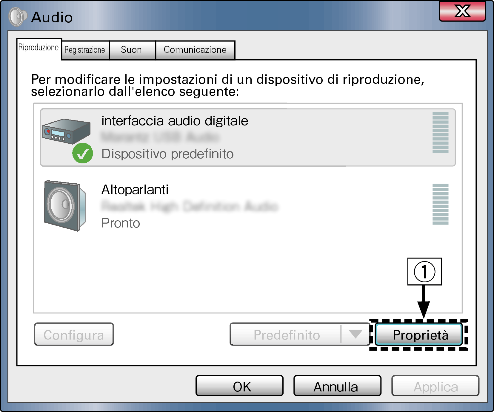 Se è presente un segno di spunta per un dispositivo diverso, fare clic su Denon USB Audio e quindi su “Predefinito”.