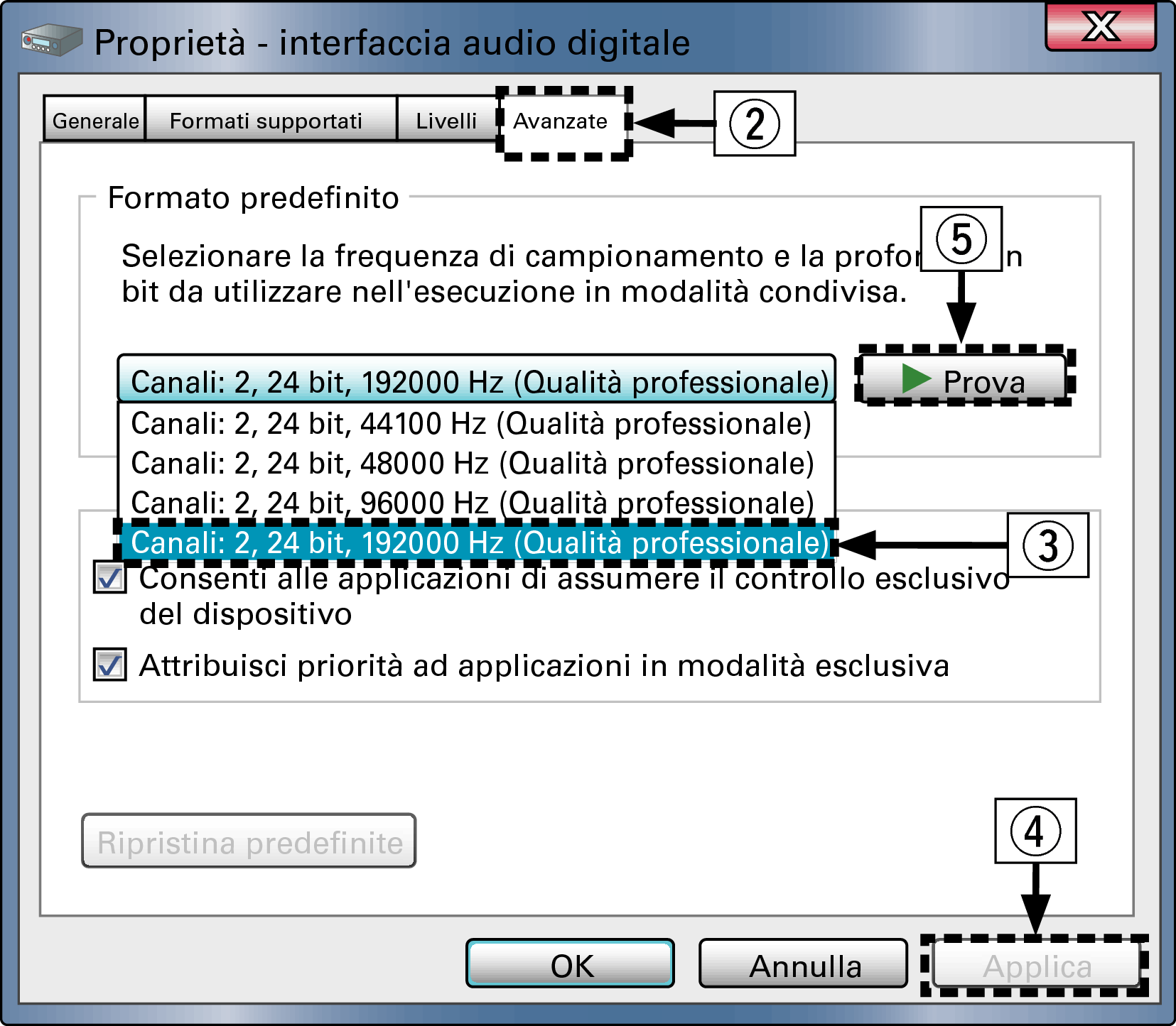 Si consiglia di selezionare “Canali: 2, 24 bit, 192000 Hz (Qualità professionale)”.