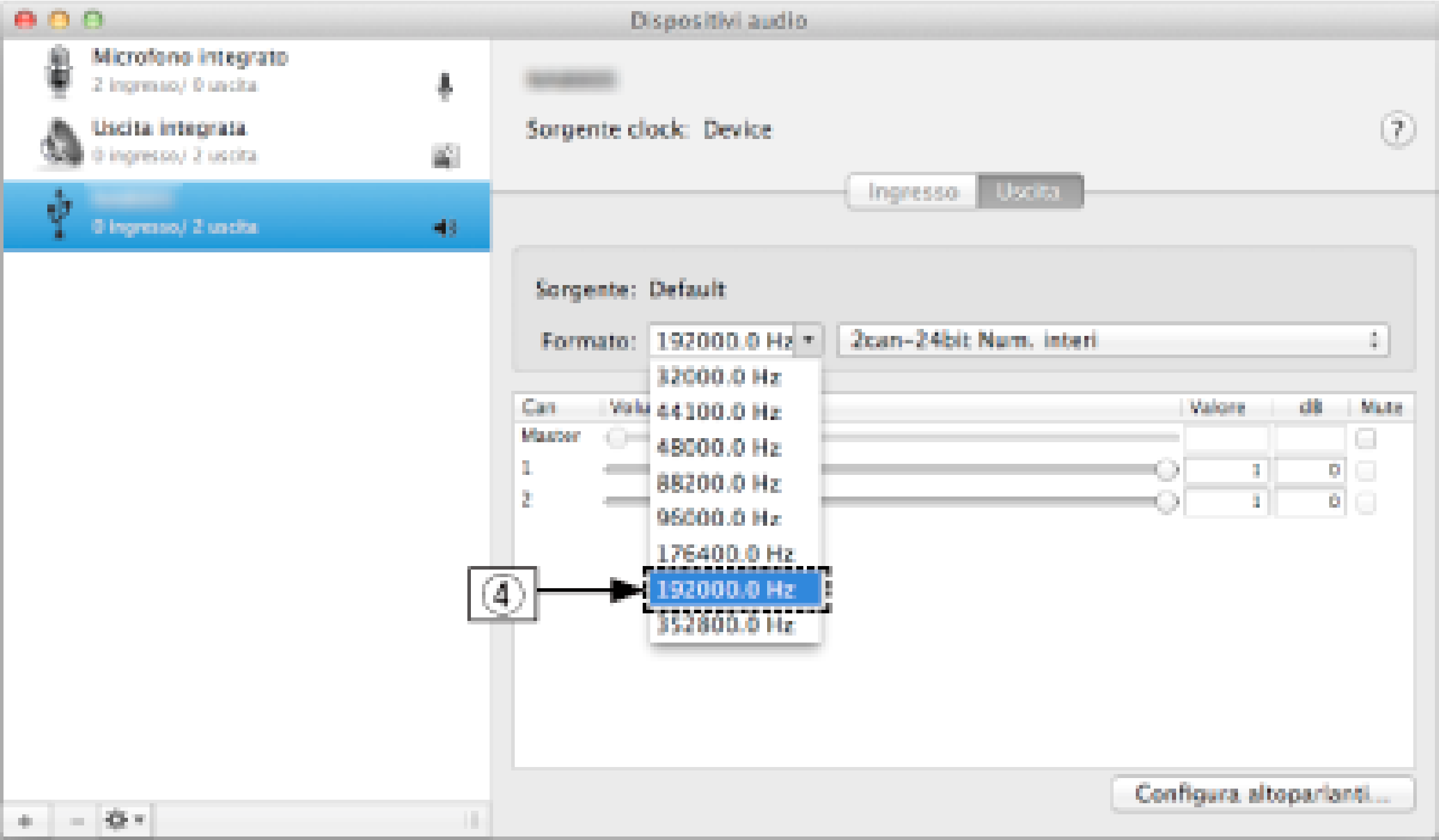 È di norma consigliabile impostare il formato su “192000.0 Hz” e “2can-24bit Num. interi”.