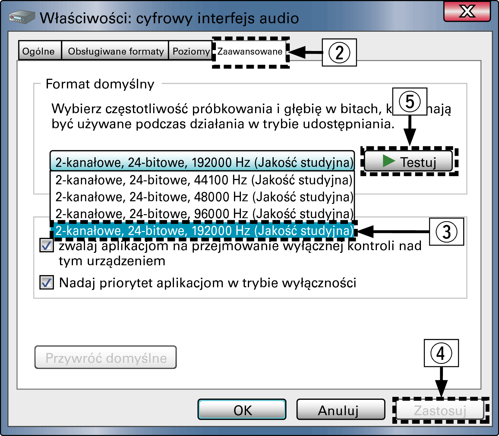 Zaleca się wybranie “2-kanałowe, 24-bitowe, 192000 Hz (Jakość studyjna)”.