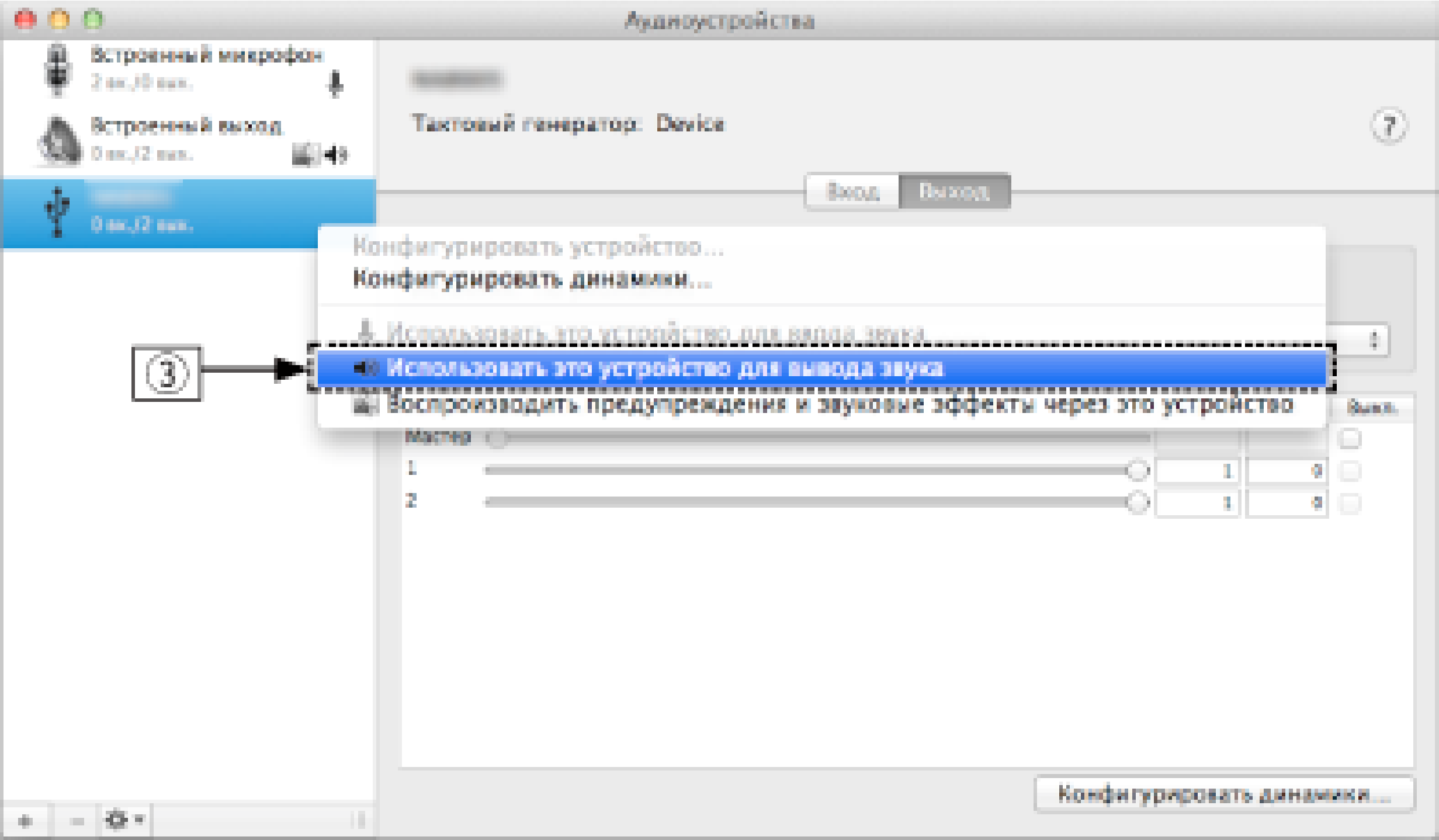 Параметры аудио устройства (только на ОС Mac X)