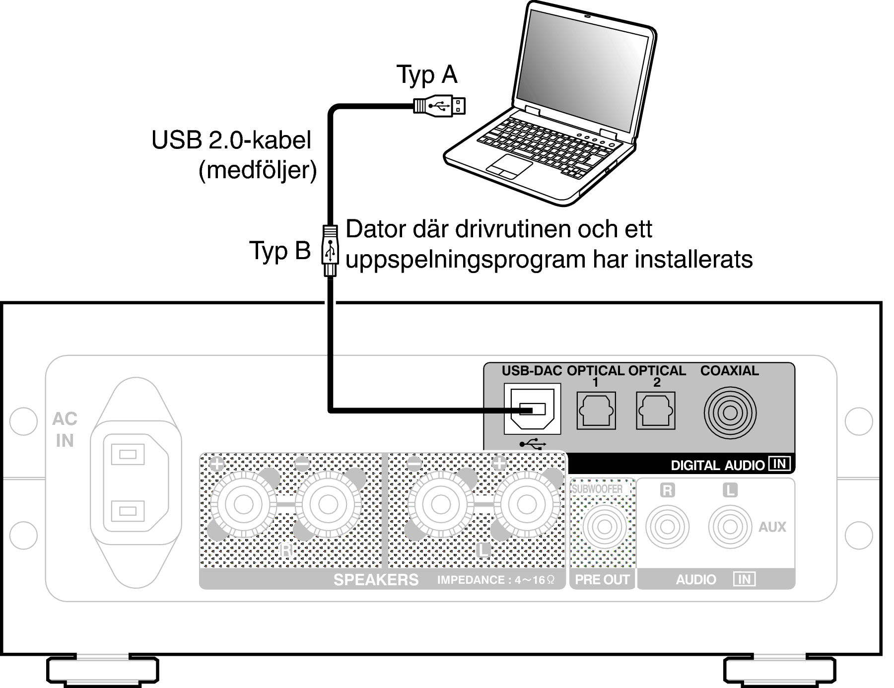 Genom att ansluta en dator till USB-DAC-porten på enhetens baksida med en vanlig USB-kabel (medföljer) kan den här enheten användas som en D/A-konverterare. länk