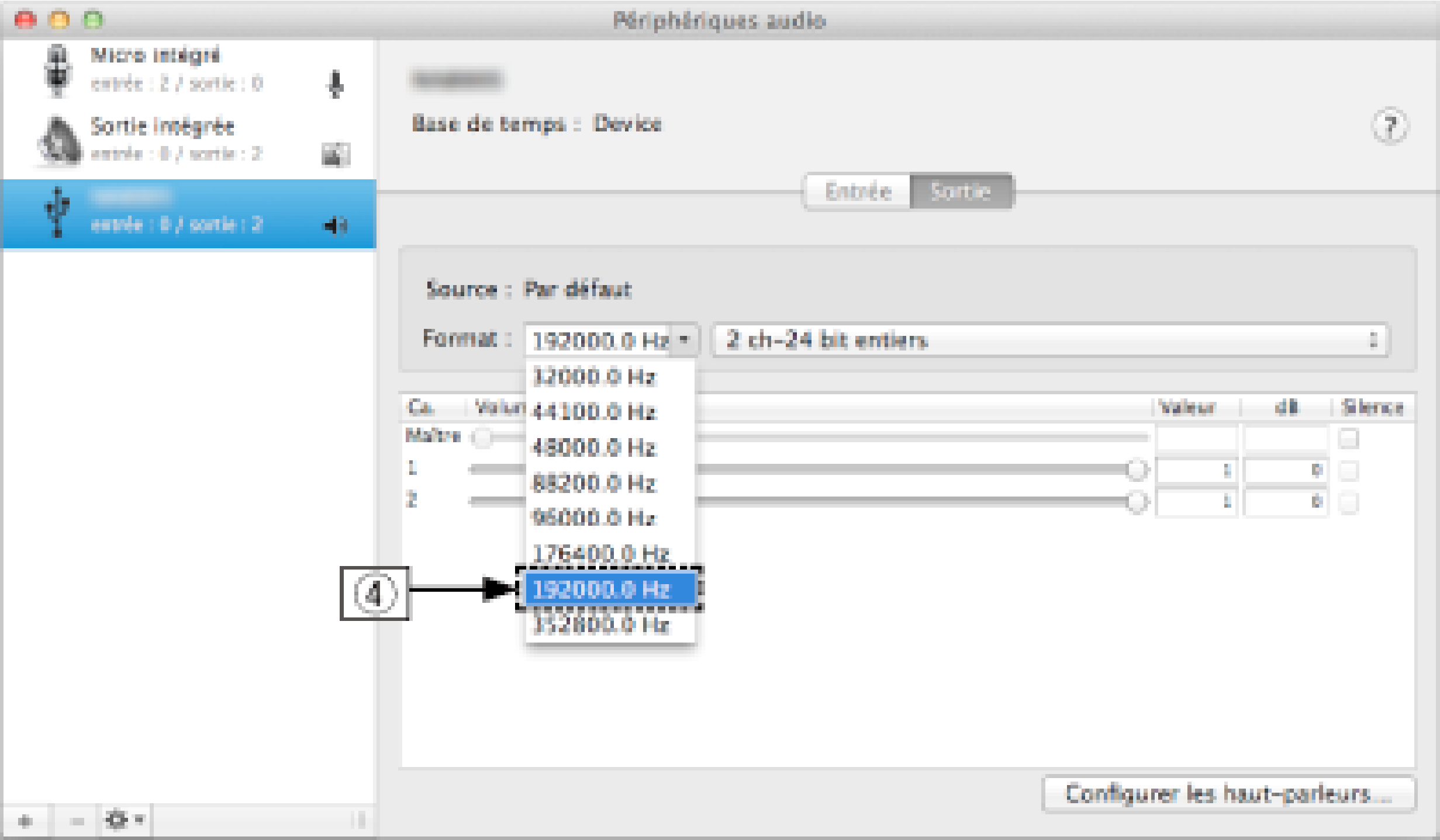 Il est généralement recommandé de régler le format sur “192000.0 Hz” et “2 ch-24 bit entiers”.