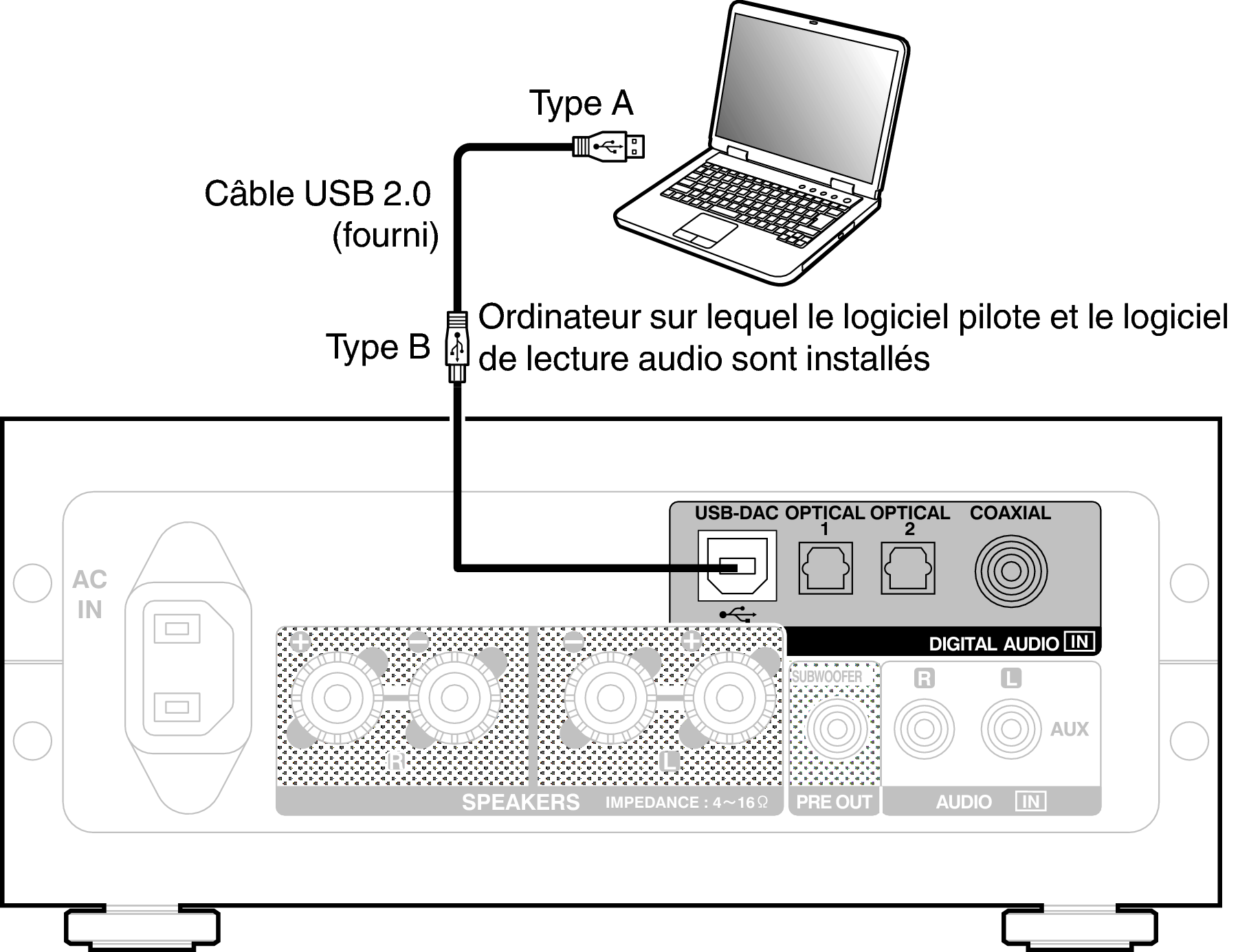 En connectant un ordinateur au port USB-DAC sur le panneau arrière de cet appareil à l’aide d’un câble de connexion USB (fourni) disponible dans le commerce, cet appareil peut être utilisé comme un convertisseur N/A. lien